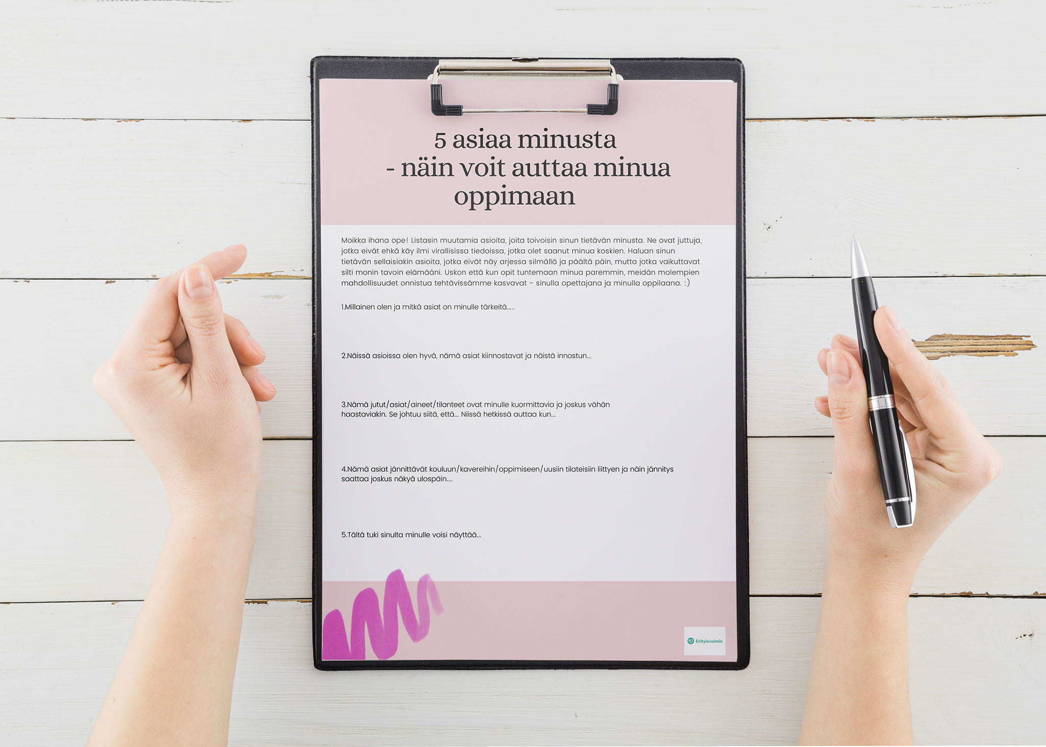 Nappaa tästä koulunaloituksen tueksi työkalu, joka auttaa opettajaa tutustumaan lapseesi, syventäen opettajan ymmärrystä lapsesi tämän yksilöllisistä tarpeista. Voitte yhdessä lapsen kanssa pohtia asioita, joita opettajan olisi hyvä tietää, jotta hän voi omalta osaltaan toimia lapsen oppimista ja hyvinvointia tukevalla tavalla. Jutelkaa näistä kaikessa rauhassa ja kirjoittakaa ne sitten ylös opettajaa varten. Työkalu toimii hyvänä keskustelun herättäjänä sekä perheen sisällä, että tukena opettajan kanssa käytävässä keskustelussa uuden lukuvuoden taas alkaessa.